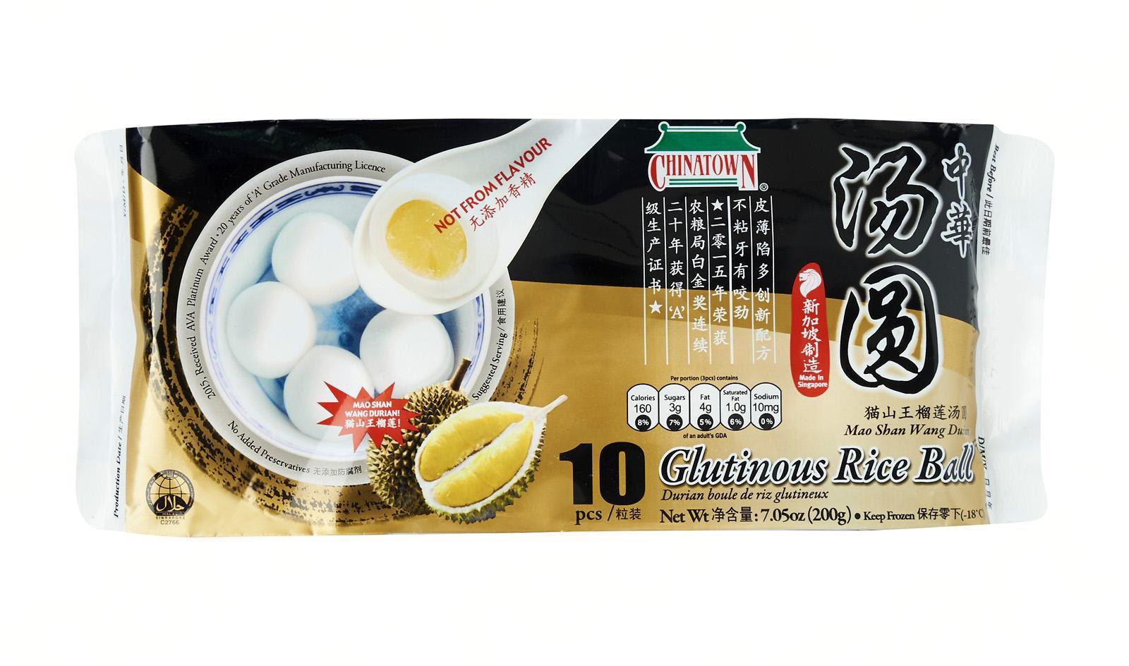 Chinatown Food Glutinous Rice Ball Mao Shan Wang is a traditional Chinese dessert manufactured frozen with no added preservatives. It is a great complement to the chewy dough texture with rich creamy Durian Mao Shan Wang fillings. Indulge your family and friends with this authentic Asian dish!